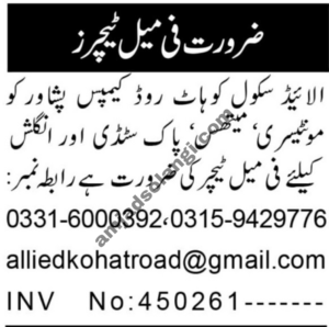 Allied School Kohat Road Campus Peshawar ne teaching positions ke liye vacancies announce ki hain. Ye positions Bachelor or Master degree holders ke liye suitable hain. School education sector ke jobs mein interest rakhne wale candidates apni skills or qualifications ke mutabiq apply kar sakte hain.