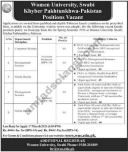 Women University Swabi ki latest jobs ke liye apply karne ki last date 17 March 2026 hai.